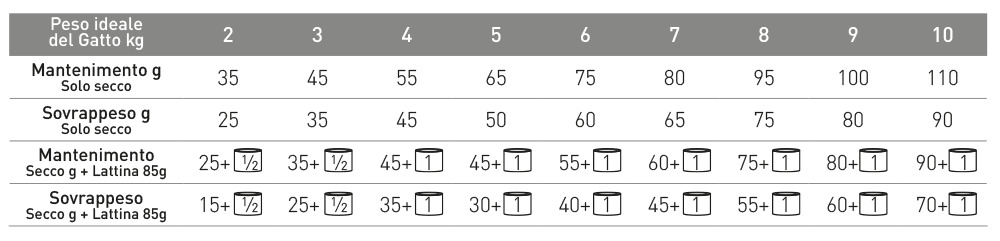 Istruzioni: si raccomanda di richiedere il parere di un veterinario prima dell’uso oppure prima di estendere il periodo di impiego. Somministrare i quantitativi indicati riportati in tabella in base al peso del gatto, come unica fonte di cibo. Si consiglia un periodo di transizione all’inizio della dieta. Ai fini di un’efficiente perdita di peso o del mantenimento del peso ideale, non dovrebbe essere superato l’apporto energetico giornaliero raccomandato.