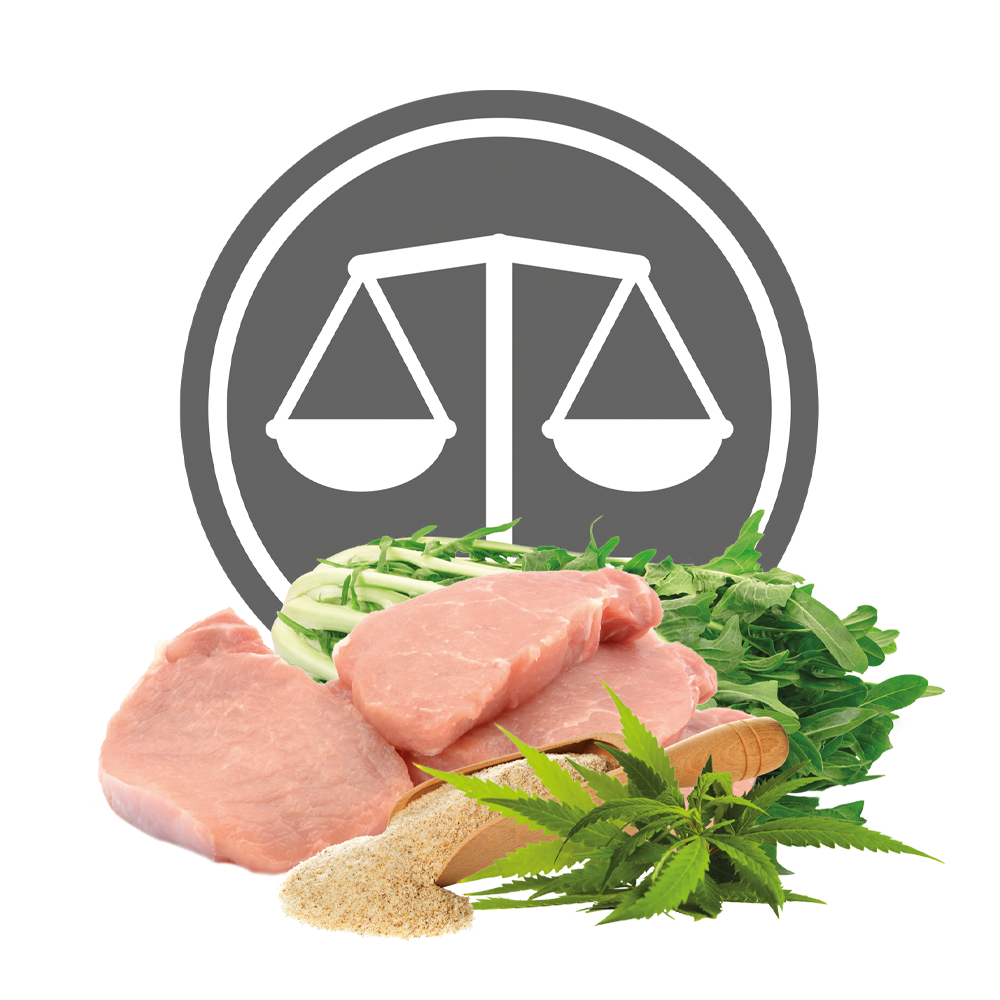 maiale disidratato (34%), sorgo, piselli, lignocellulosa, tegumento e semi di psyllium (4%), proteine di maiale idrolizzate, erba medica disidratata, olio di salmone, polpa di barbabietola essiccata, grasso di maiale, polpa di cicoria essiccata (2%), lieviti, canapa (1%), fibra di piselli, fruttoligosaccaridi (0,5%), galattoligosaccaridi (0,5%), carbonato di calcio, solfato di calcio diidrato, cloruro di sodio, mannanoligosaccaridi (0,2%), β-1,3/1,6 glucani da parete cellulare di lievito Saccaromyces cerevisiae, glucosamina (0,06%), solfato di condroitina (0,03%)